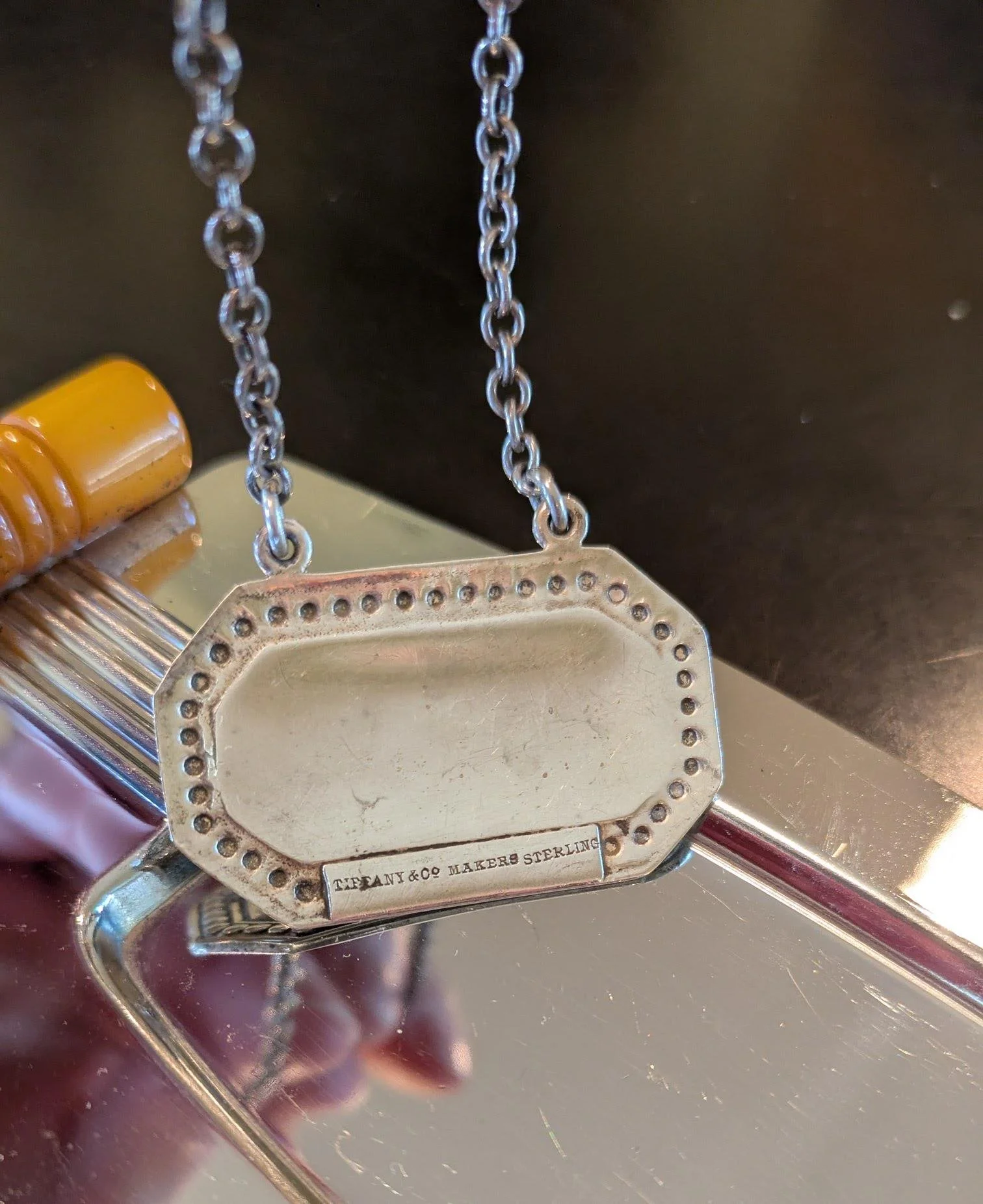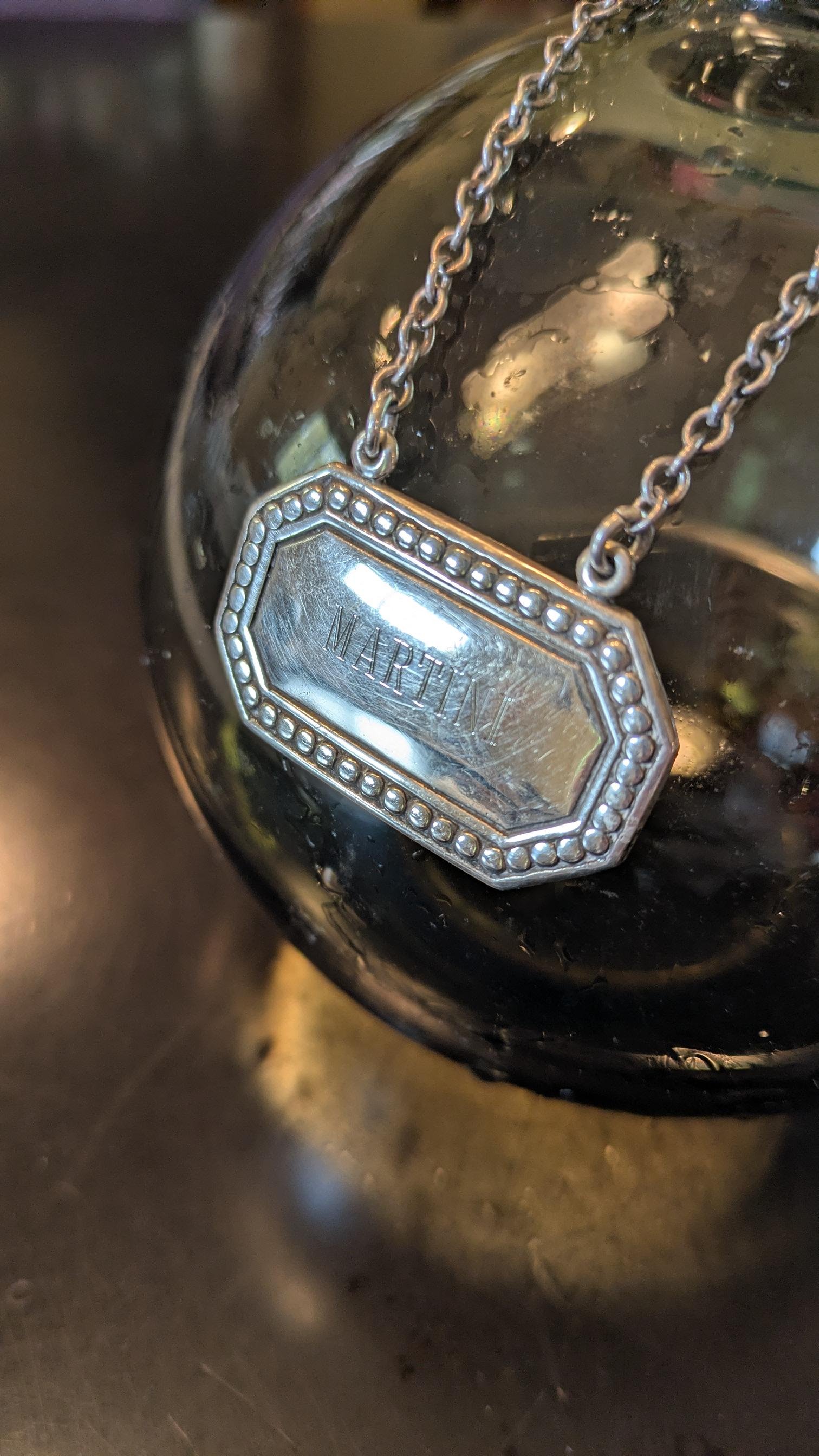 A beautiful decanter tag of sterling silver made by Tiffany. Simple Art Deco design and etched "MARTINI" will be a conversation starter at your next cocktail party. This liquor label is perfect for that decanter of pre-mixed martinis or to wear proudly as a necklace. The Tiffany brand would approve! She's approximately 1-5/8" wide x 1" tall plus the chain. Please message me for more information or photos. (note decanter and tray not included)