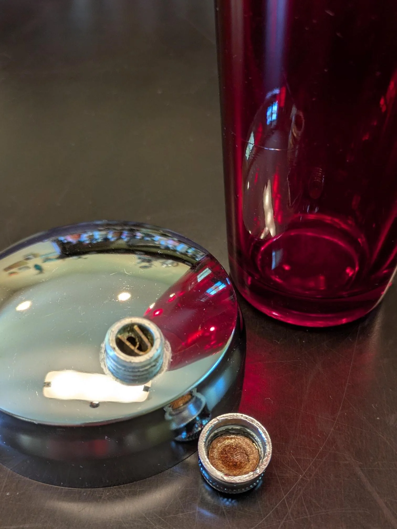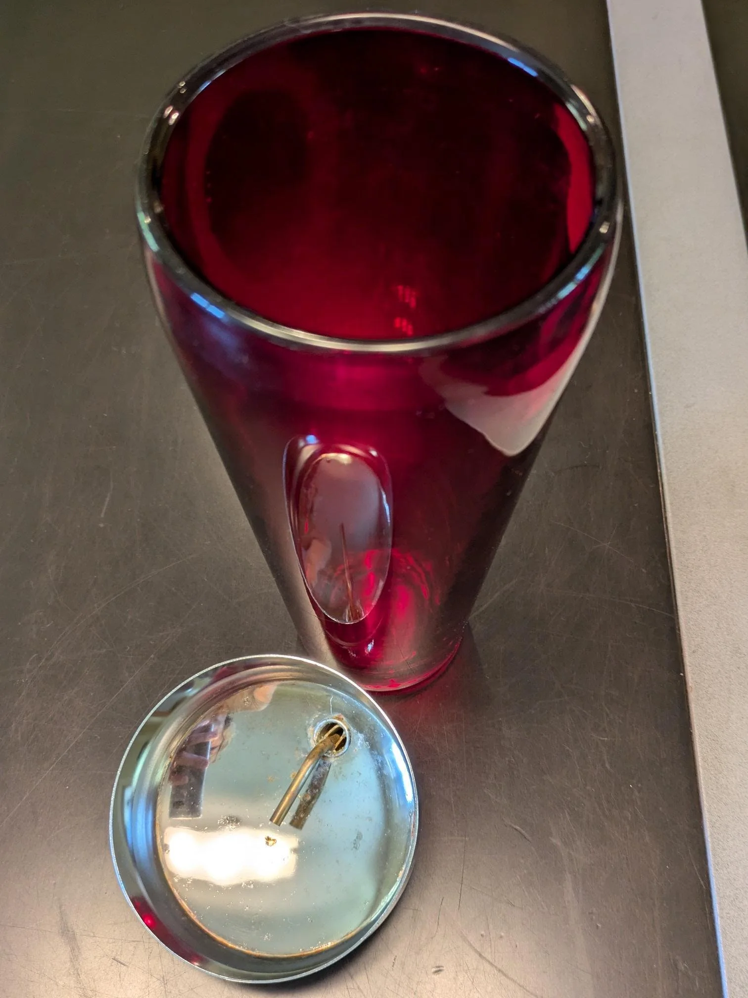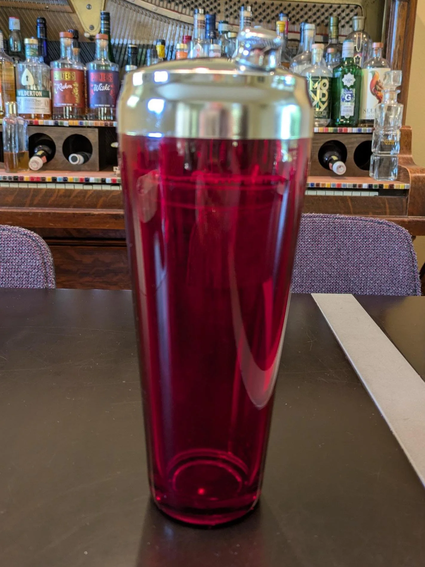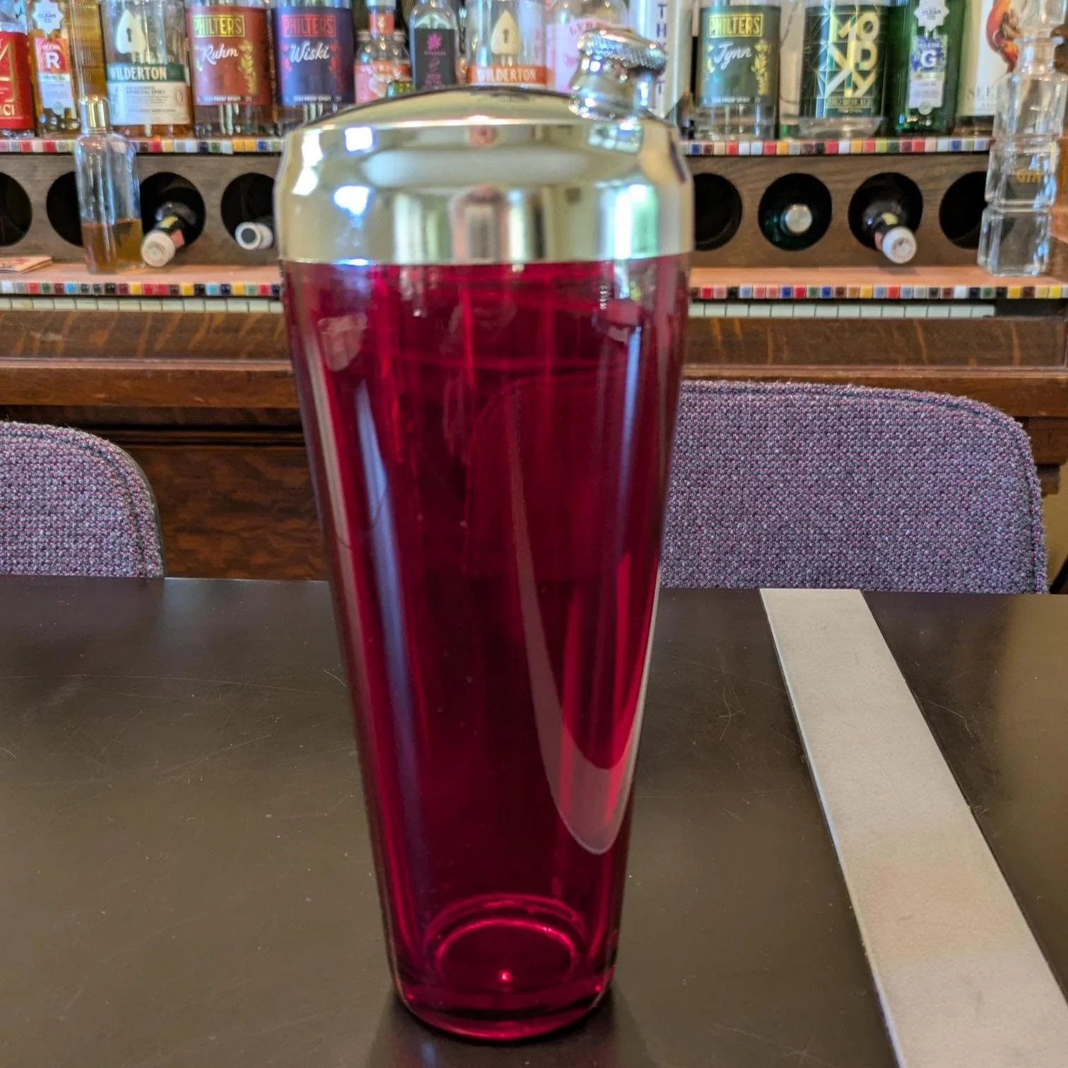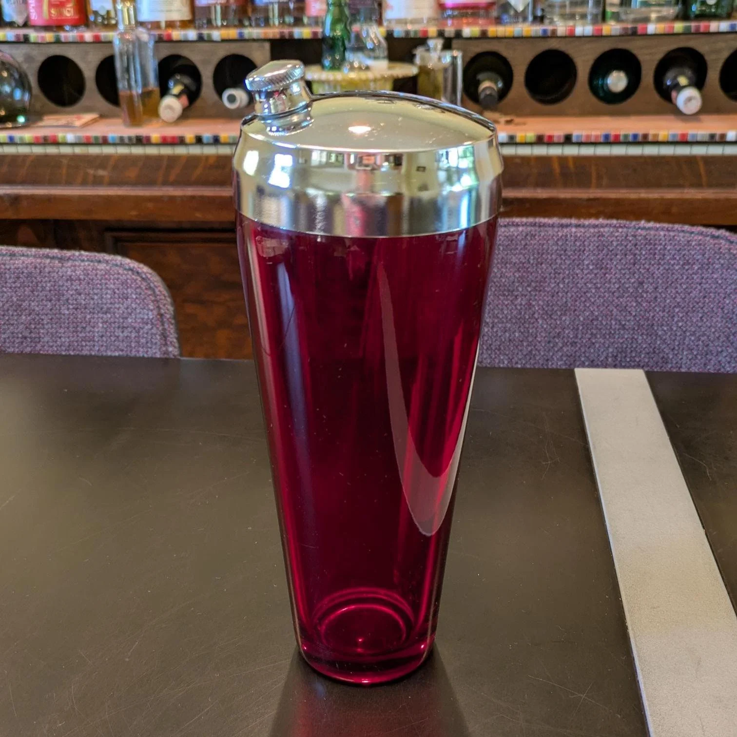 A beautiful 1920s era ruby red glass cocktail shaker. Tapered body with an aerator pipe built into the lid for a smooth pour. No chips or cracks. Minimal rust inside the lid. She's 9" tall (not including the spout) x 3.75" at the widest point.